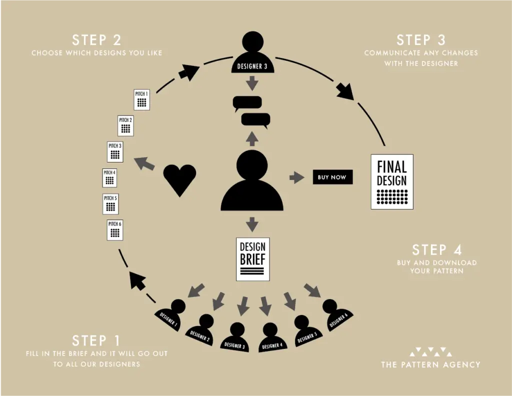 Pattern Pitch is the service that allows you to outsource specific design assignments to our 30 designers. The entire flow is managed digitally on the site; from brief, selection of pitch and communication with designer to payment and final delivery.