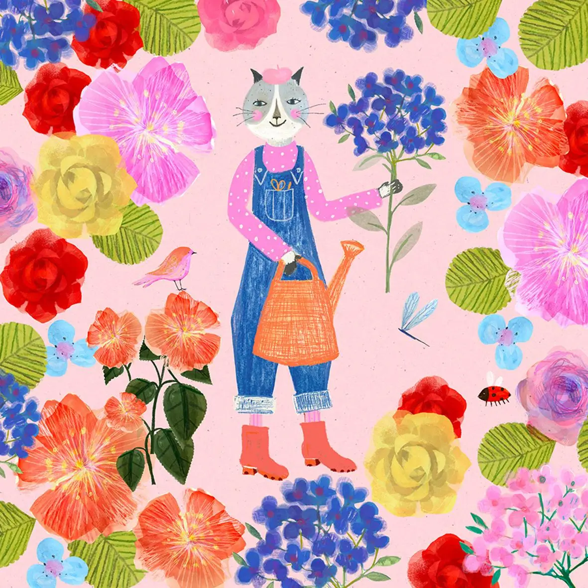 I love working with both. Working by hand is fun because you can’t fully control the process—you get wonderful textures and happy accidents. I also like to take my handmade art and finish it digitally in Procreate, where I can zoom in and add finer details.