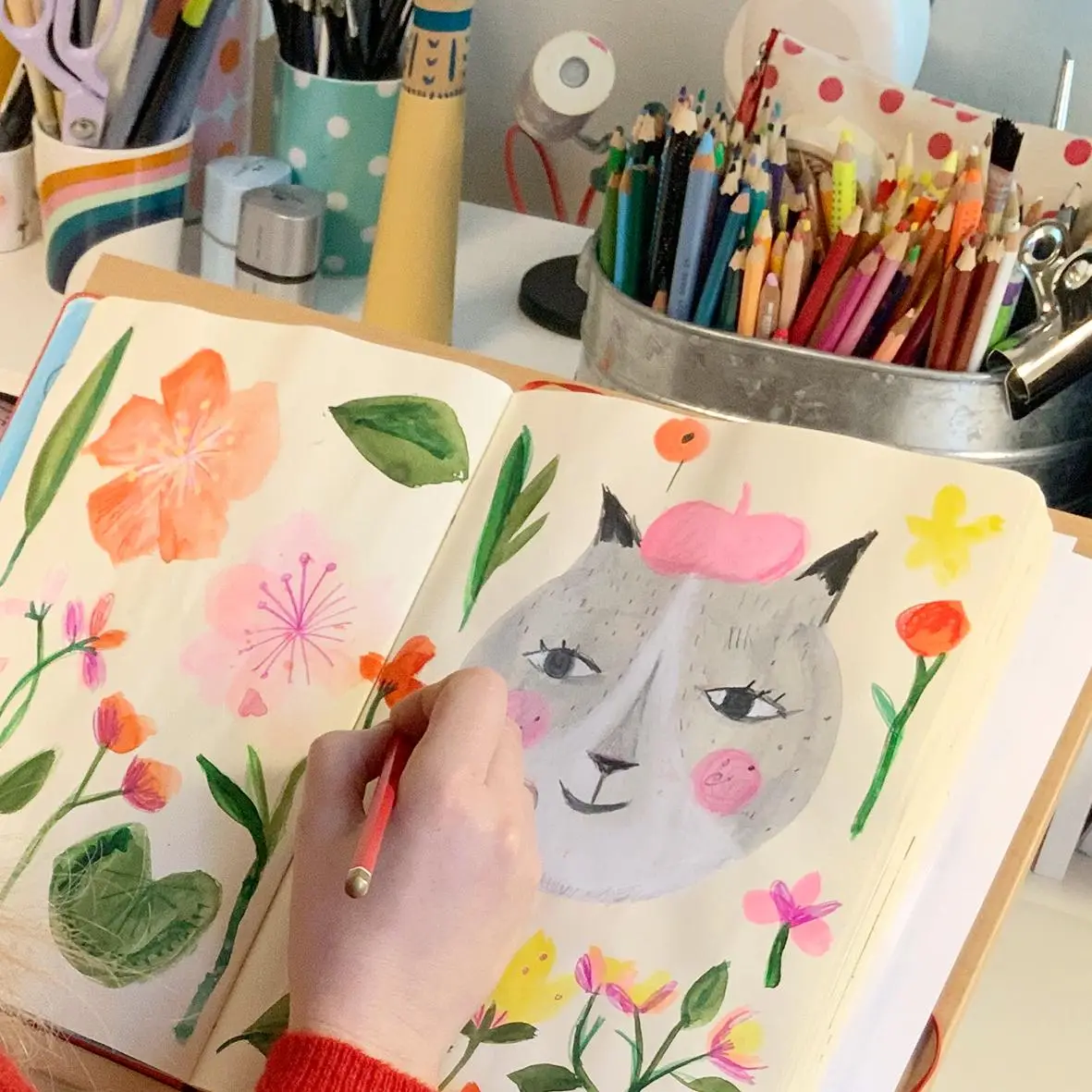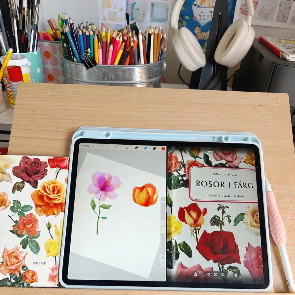 My favorite tools are sketchbooks by Royal Talens (I love the coloured covers), Gansai Tambi watercolours from Japan, coloured pencils, and Procreate for digital work. I’ve recently been using Adobe Fresco and Affinity Designer for vector art.